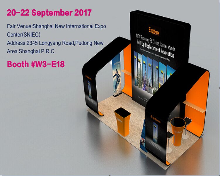 September 20-22 2017, Expomax will attend Shanghai New International Expo Center(SNIEC) in 2345 Longyang Road, Pudong New Area Shanghai P.R.C. Our booth No is W3-E18. Expomax will bring New Economy SEZ Tube Banner Stands, 25mm tube banner stands( roll up replacement revolution), display counters, square arches, literature stands and so on. Your visit is warmly welcomed.
